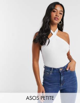 Evesham Nj Design Petite Halterneck Bodysuit With Cross Front In White Evesham Nj - This hot bodysuit will have you looking cool this season.